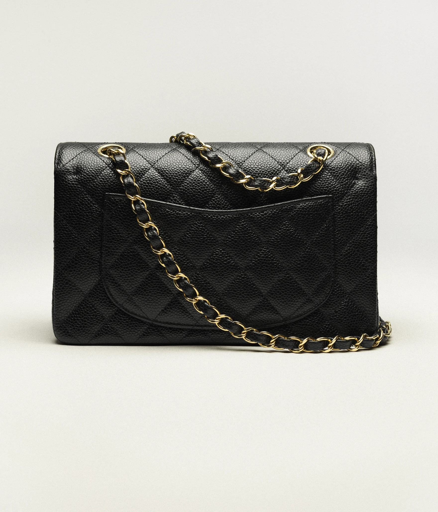- Brief description:This small classic handbag features textured grained calfskin paired with elegant gold-tone hardware. Its compact dimensions (5.7 x 9.1 x 2.4 in) make it perfect for carrying essentials, while the structured silhouette and luxurious materials ensure a polished look for day or evening occasions.